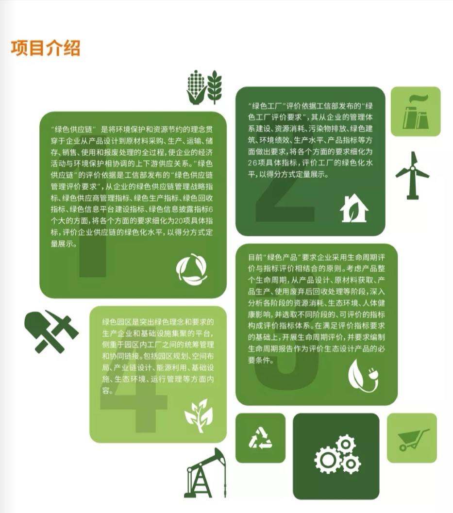 为“绿色供应链”申报企业提供供应商风险等级评价、供应链绿色数据平台建立与管理、产品有毒物质检测与评价、产品回收利用管理、绿色信息披露、企业节能减排、碳足迹、环境评价、企业社会责任评价等服务。