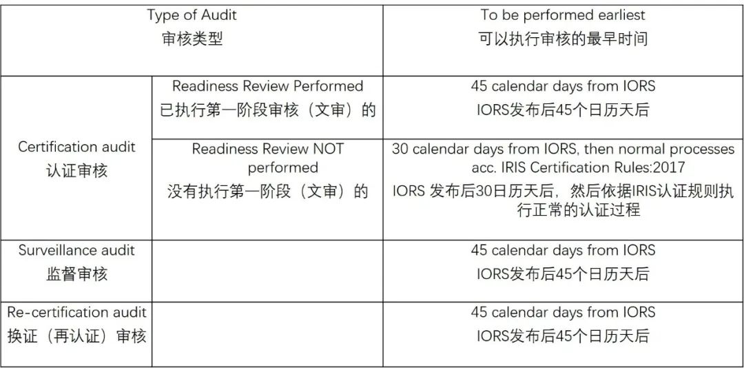 所有审核类型应从发布的IORS后45个日历天后执行, 该IORS基于IRIS网站的正式通知。
