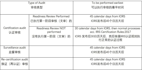 注:依据IRIS认证规则,认证审核时现场审核的最后一天作为该组织的参考日期,认证审核后每次正常审核(监督审核、再认证审核)应在该参考日期前完成。由于受COVID-19影响,IRIS管理中心规定对该期限延长3个月。