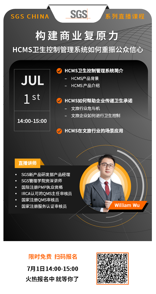 SGS与大家共抗疫,文化、娱乐、旅游行业如需快速构建商业复原力,复工复产后,向公众展示组织的卫生承诺,重振公众信心以促进消费复苏,千万不要错过这场直播课,限免,免费期过后将恢复原价69RMB,快报名参加!