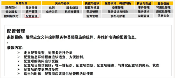 ISO/IEC 20000是为IT服务管理而制定的一个标准,使组织能了解如何从内部和外部改进其服务质量,它对配置管理提出了明确的要求,我们可以参照这个标准的要求来进行配置管理的建设。