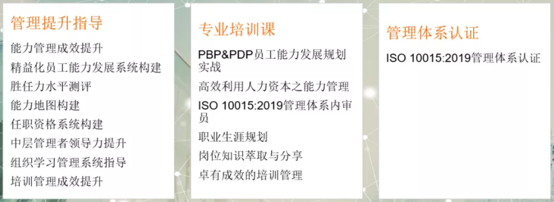 现在,SGS结合ISO10015的方法论及成功企业的能力管理经验,推出一系列行之有效的解决方案,指导组织构建卓有成效的能力管理,让能力发展与组织发展需求强关联,让员工清楚地认识到个人能力提升与组织和团队发展的联系,激发员工成长,从而为组织贡献更多价值。