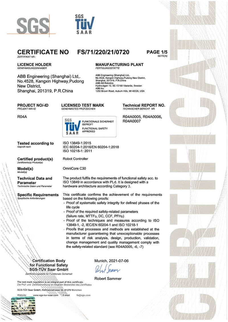 近日,国际公认的测试、检验和认证机构SGS为上海ABB工程有限公司(以下简称:ABB)旗下的CRB 15000 机器人控制器OmniCore C30颁发SGS TÜV SAAR证书,标志着该产品满足ISO 13849-1: 2015功能安全标准的严格要求,安全功能的电路架构满足Cat.3,并且达到PLd安全等级。同时,该系列产品满足IEC/EN 60204,ISO 10218-1的电气安全等严格要求。