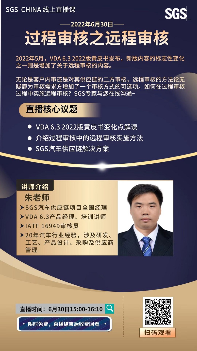 2022年5月,VDA 6.3 2022版黄皮书发布,新版内容的标志性变化之一则是增加了关于远程审核的内容。无论是客户内审还是对其供应链的二方审核,远程审核的方法论无疑都为审核需求方增加了一个审核方式的可选项。如何在过程审核过程中实施远程审核?SGS专家与您在线沟通