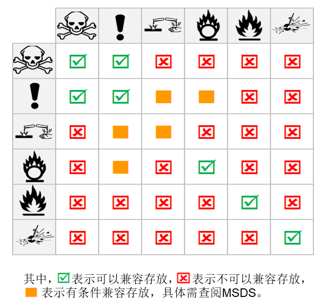 危险化学品的危害类别需要参照MSDS,也可以根据象形图对危险化学品的兼容性进行简单的判断: