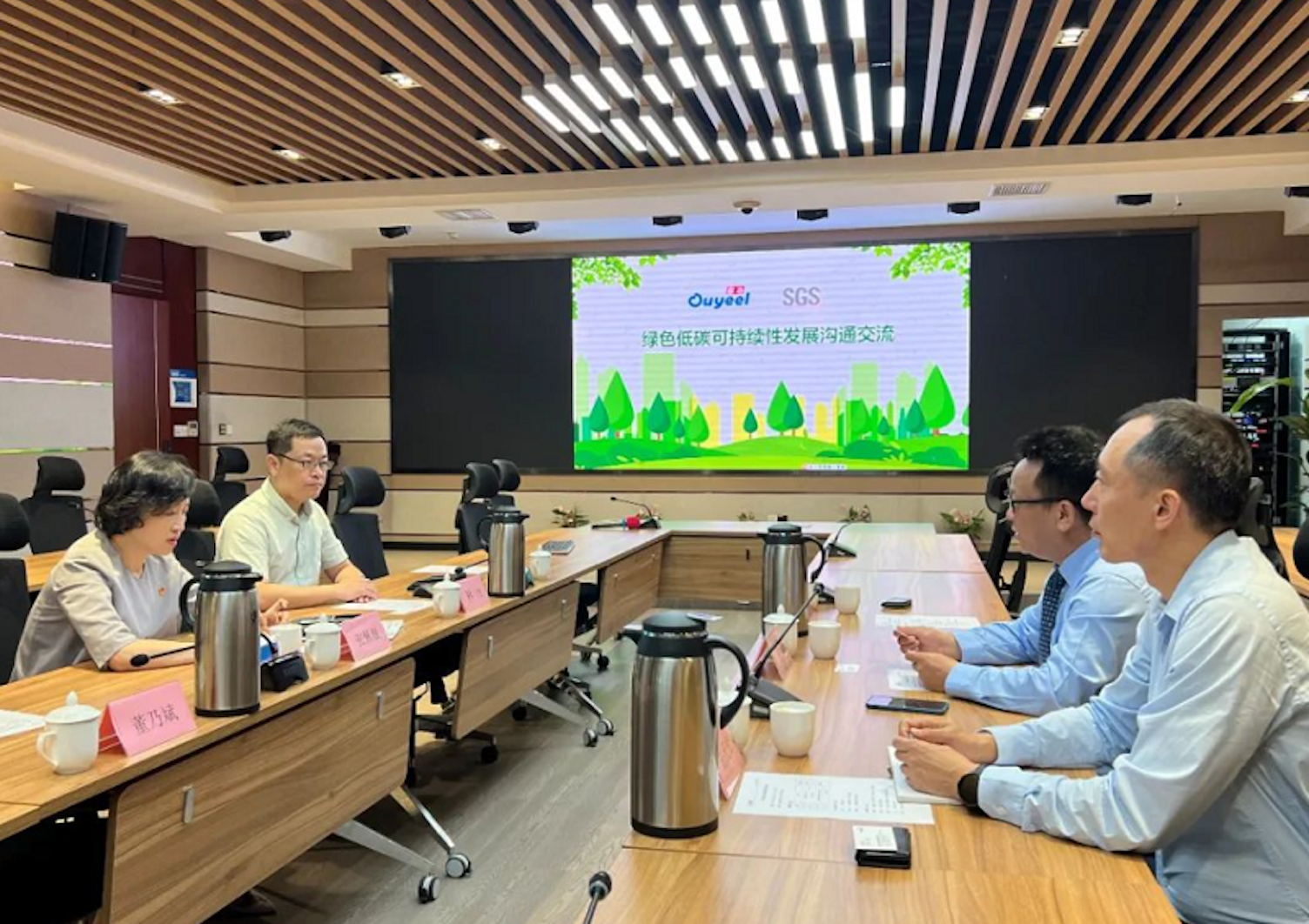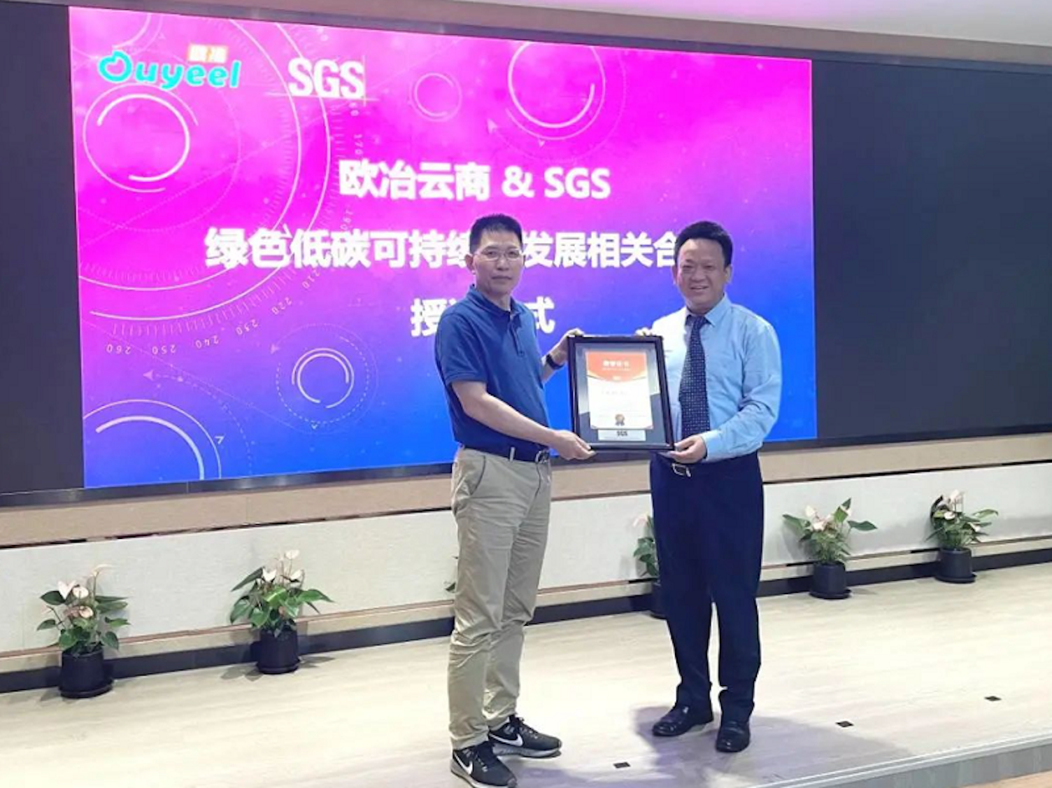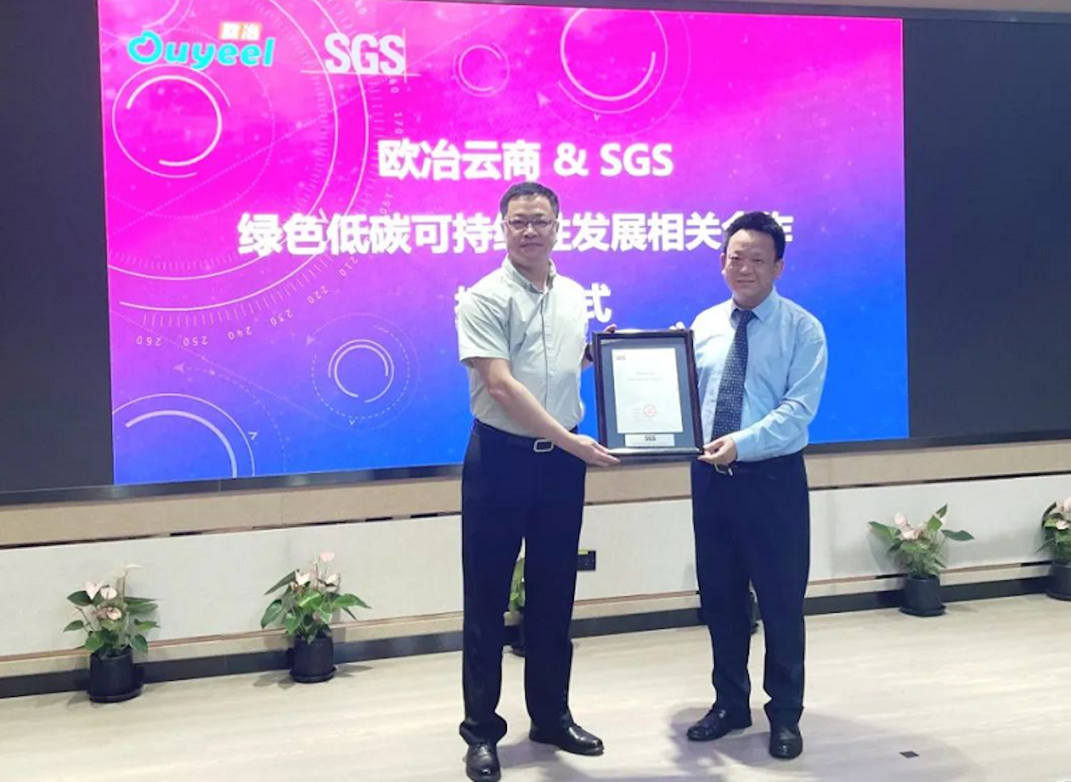 双方在欧冶云商举办授证仪式,SGS知识与管理服务事业群总经理辛斌先生、SGS风险管理解决中心中国区总经理岳庆松先生、欧冶云商高级副总裁张佩璇女士、欧冶云商碳中和办公室主任程远明先生等领导出席此次会议。
