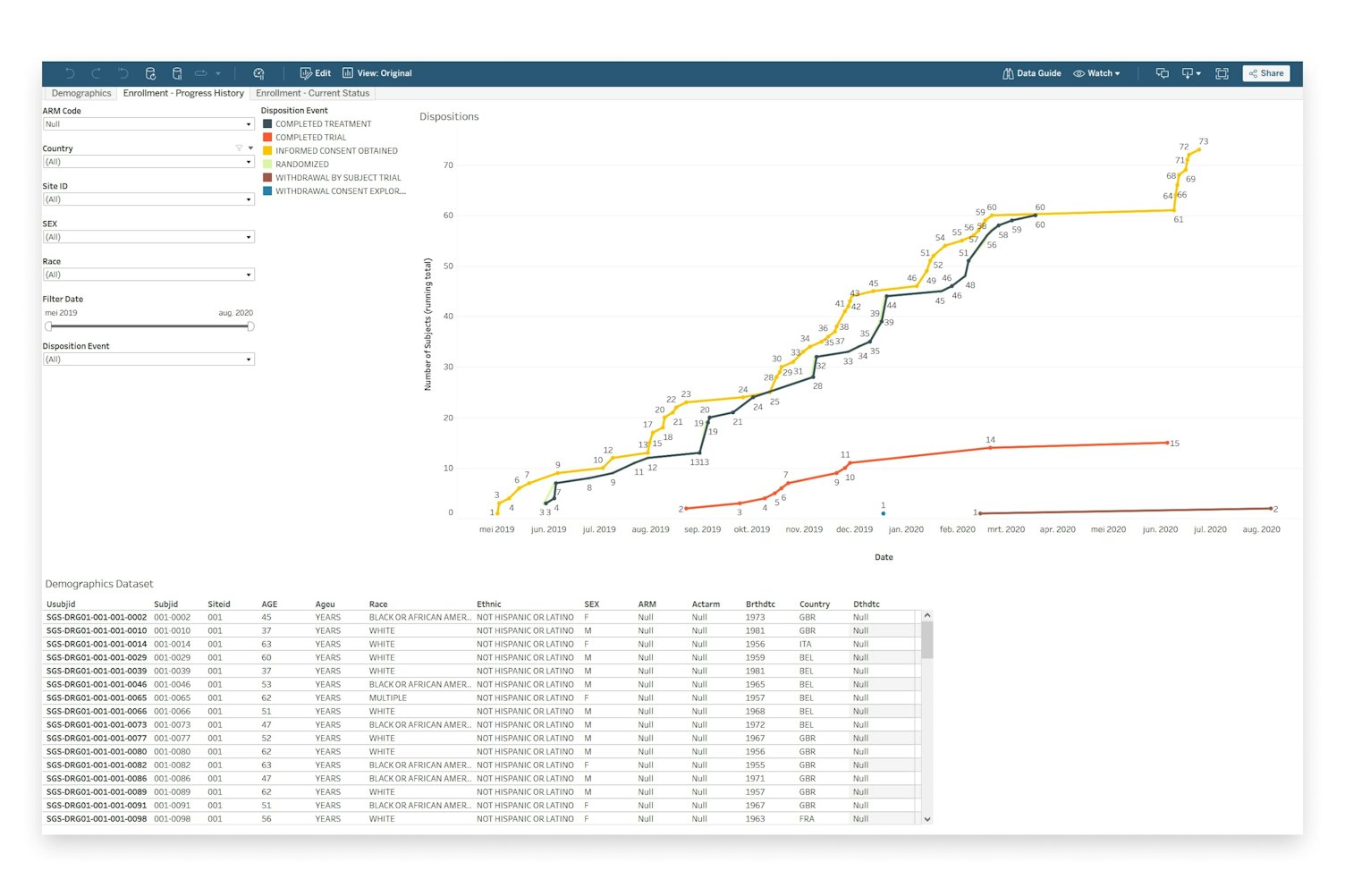 利用 SGS 全面的数据可视化界面,充分挖掘临床试验数据的潜力。我们与功能强大的个性化分析软件行业领导者 Tableau 建立了合作伙伴关系,可确保您全面了解和控制临床研究的进展情况。
